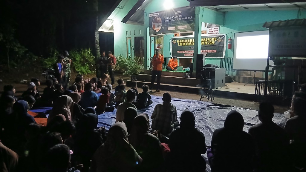 Lombok Barat, NTB – Satuan Tugas (Satgas) TNI Manunggal Membangun Desa (TMMD) Ke-126 Komando Distrik Militer (Kodim) 1606/Mataram bersama Dinas Kesehatan (Dinkes) dan Badan Penanggulangan Bencana Daerah (BPBD) Kabupaten Lombok Barat (Lobar) menggelar sosialisasi kesehatan lingkungan dan penanggulangan bencana alam di Rumah Produksi Gula Aren, Dusun Tempos Madani, Desa Giri Madia, Kecamatan Lingsar, Lobar, Sabtu malam (25/10/2025).